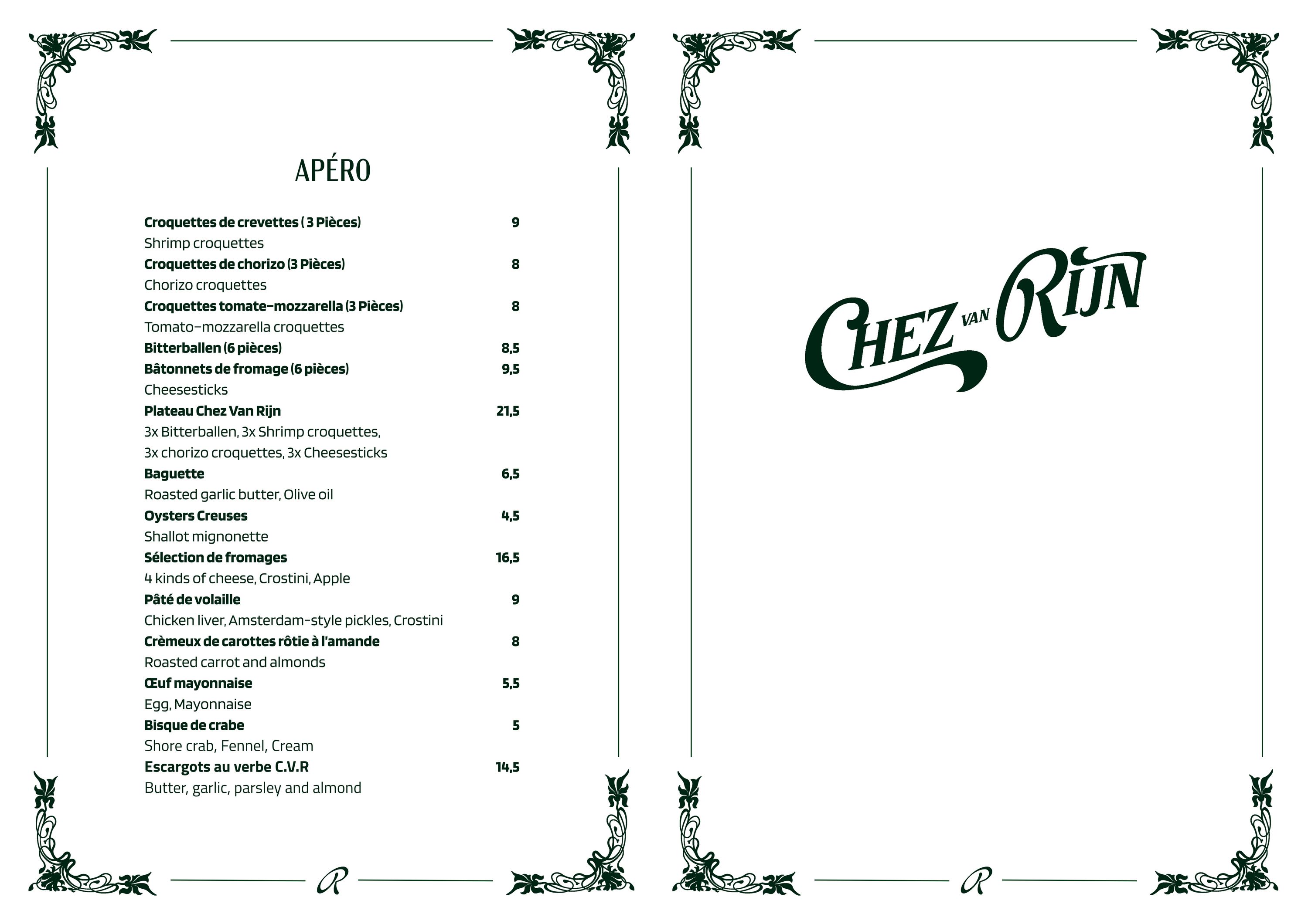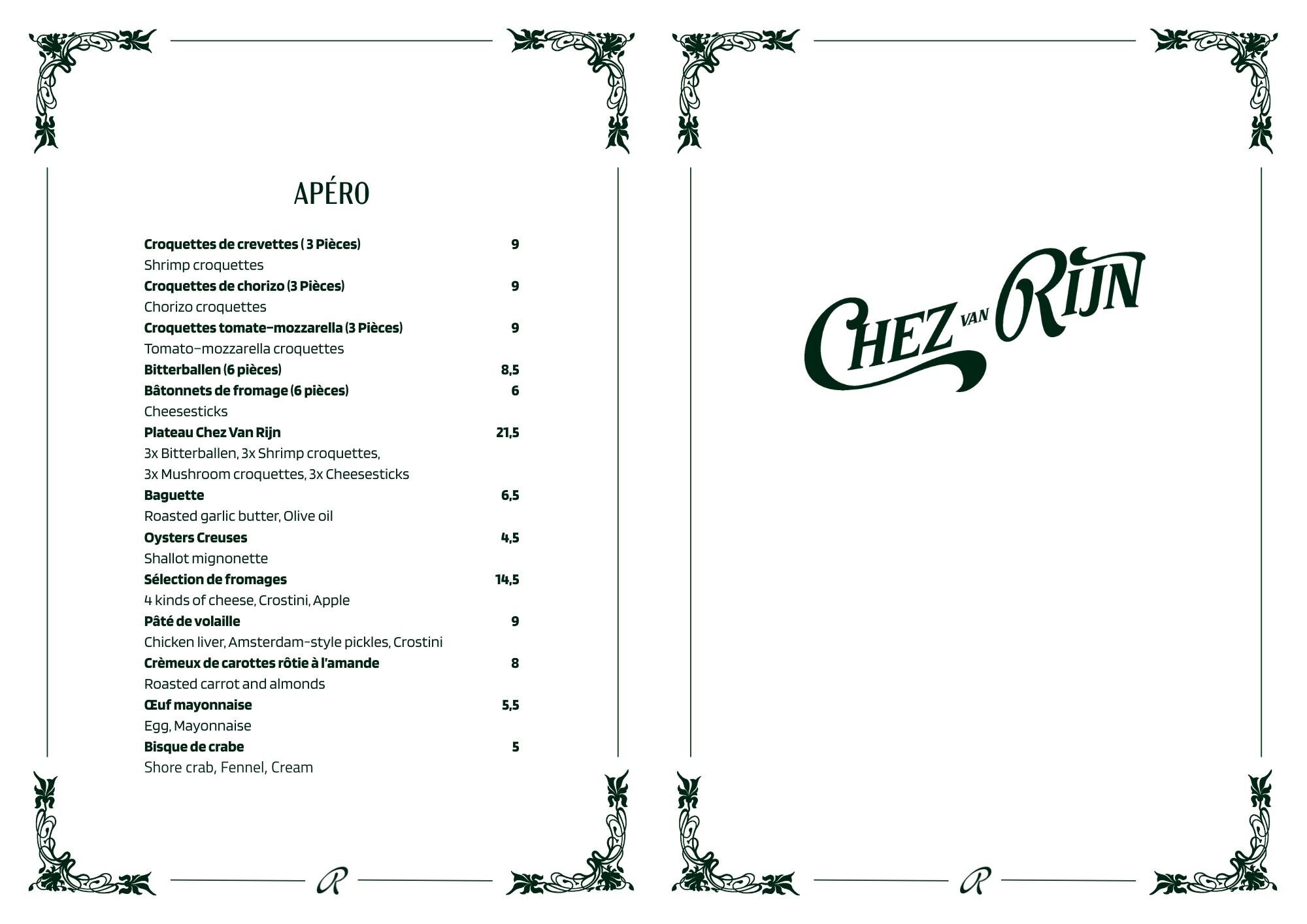 Available daily from noon until 22:30. Ideal for casual drinks or a light bite before dinner. Order the Platter Van Rijn to share or go straight for fresh oysters and perfectly fried bitterballen.