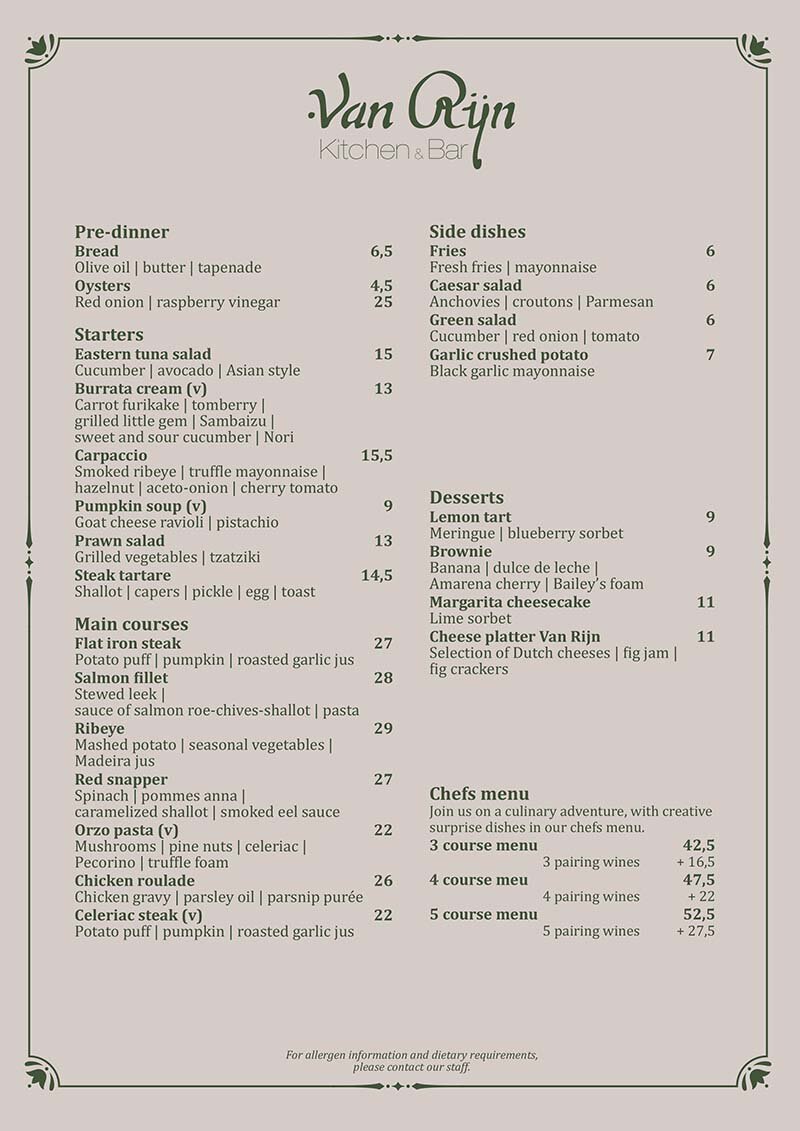 Start with oysters or carpaccio, then choose flat iron steak, red snapper, ribeye or the popular Chef’s 3–5 course menu. Perfect for intimate dinners or lively nights out on Rembrandtplein. Book ahead or walk in.