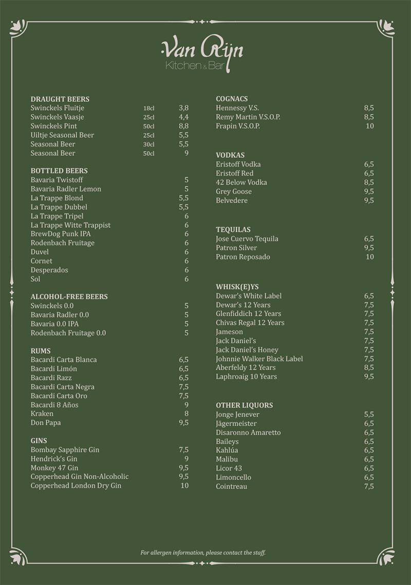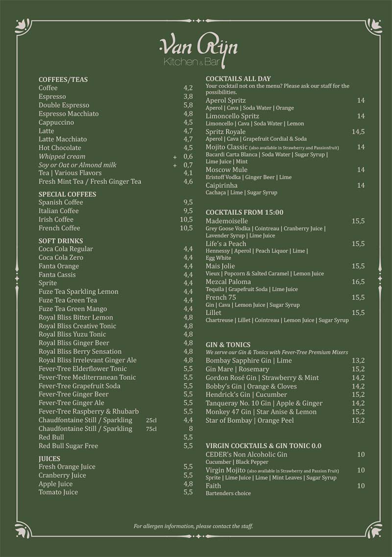 Open daily from 10:00 until late. Enjoy Aperol Spritz in the sun, crafted cocktails after 15:00, ice-cold draught beers, non-alcoholic options or a nightcap from our wide selection of gins, whiskies and cognacs.