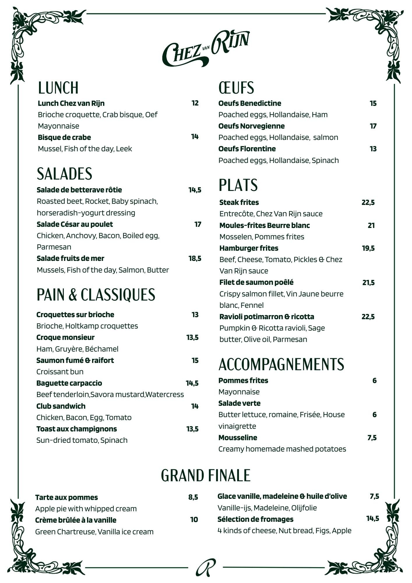 Join us for relaxed lunch on Rembrandtplein: club sandwich, soup, salads, eggs and our famous Steak Frites.