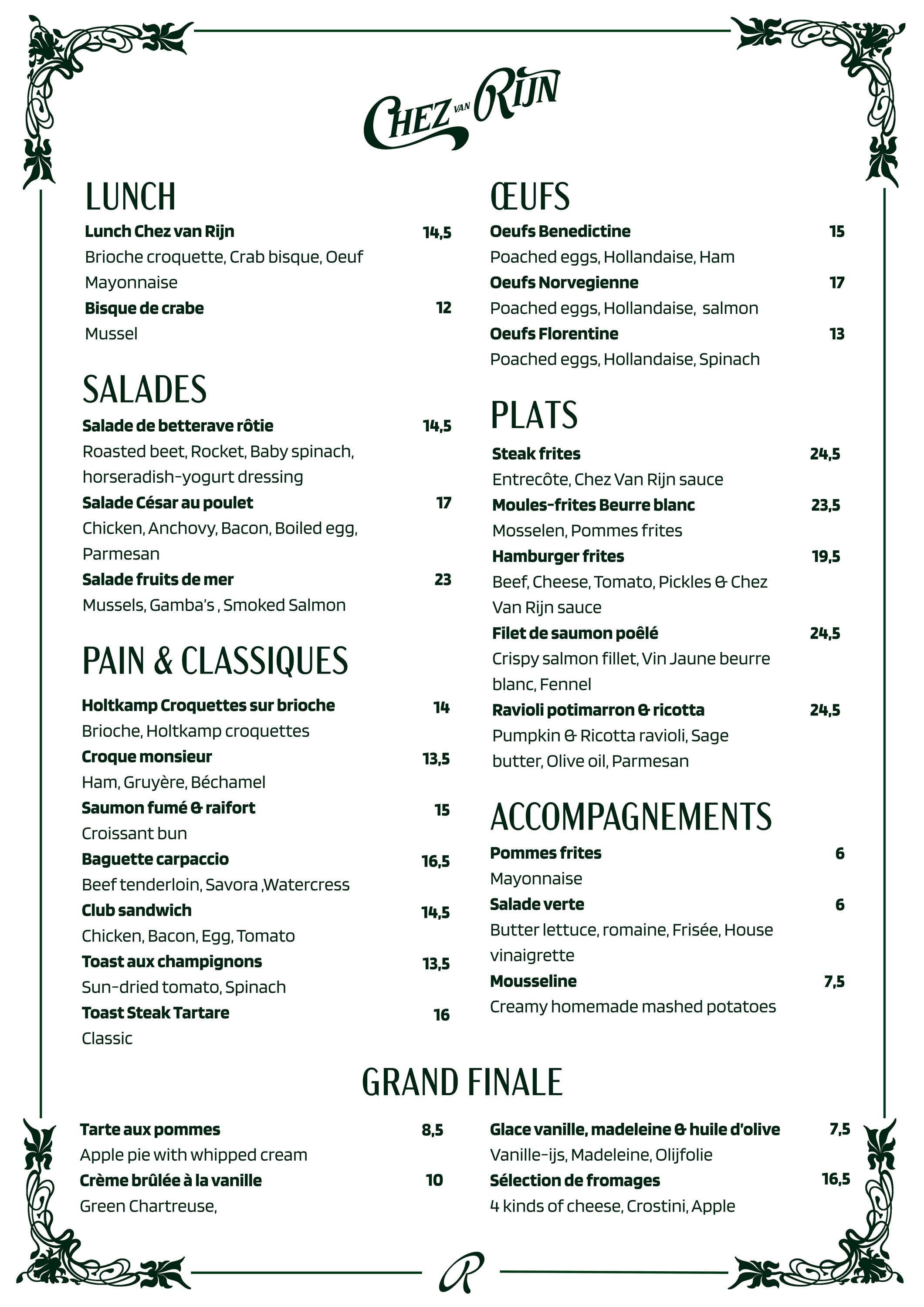 Served every day until 16:00. Choose from classic and signature dishes like the Steakfrites, Caesar or roasted beet salad, poached eggs and a wonderful bisque. Perfect for a quick bite or long lunch with friends. Book a table or just walk in.