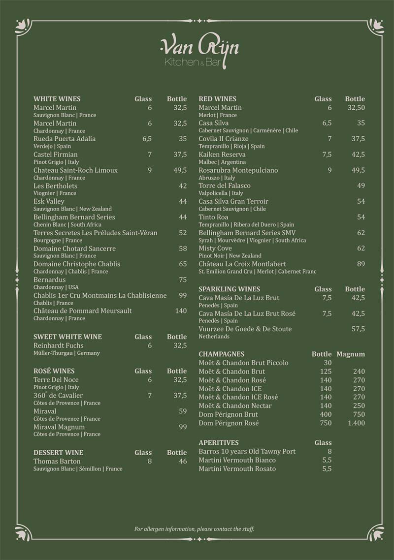 Carefully chosen house wines from €6 a glass, beautiful bottles up to grand crus, and champagne for every celebration.